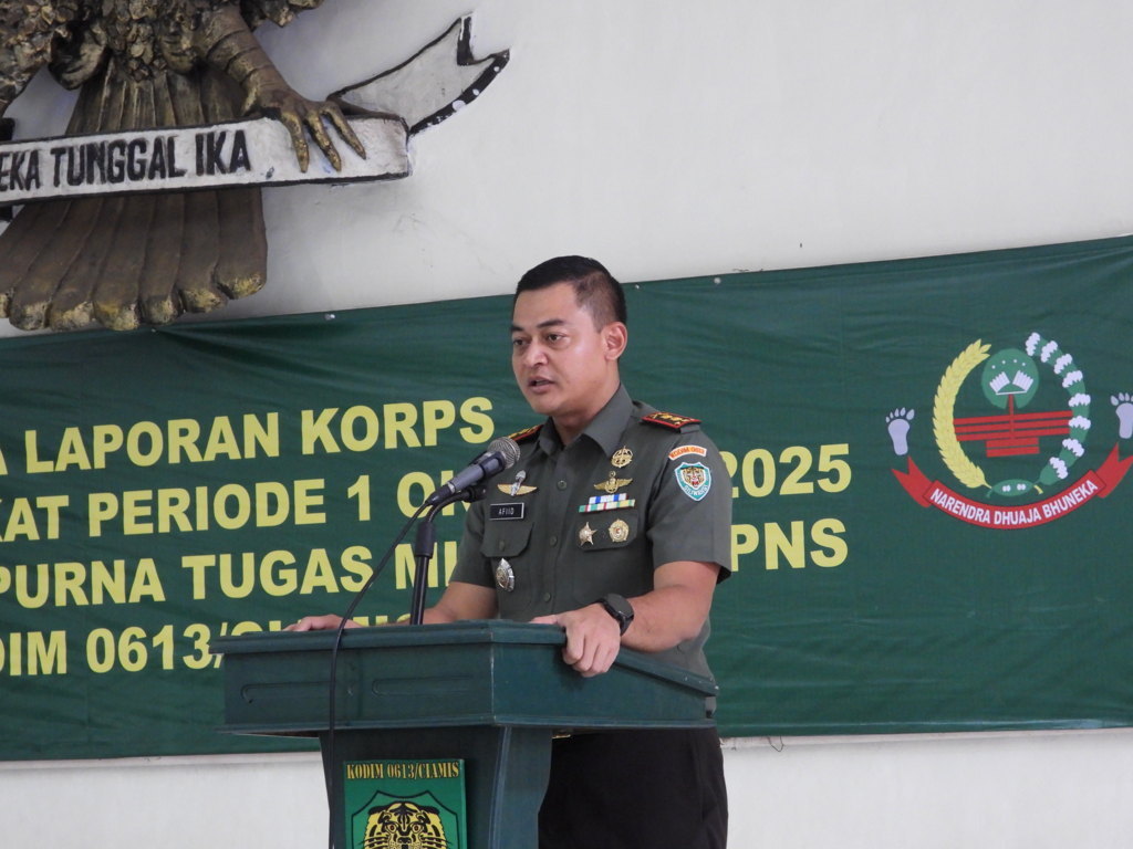 Ciamis – Kodim 0613/Ciamis menggelar upacara Korps Raport kenaikan pangkat dan purna tugas prajurit bertempat di Makodim 0613/Ciamis, Jl. A Yani No.138 Kertasari Kabupaten Ciamis Jawa Barat, Kamis (02/10/2025).